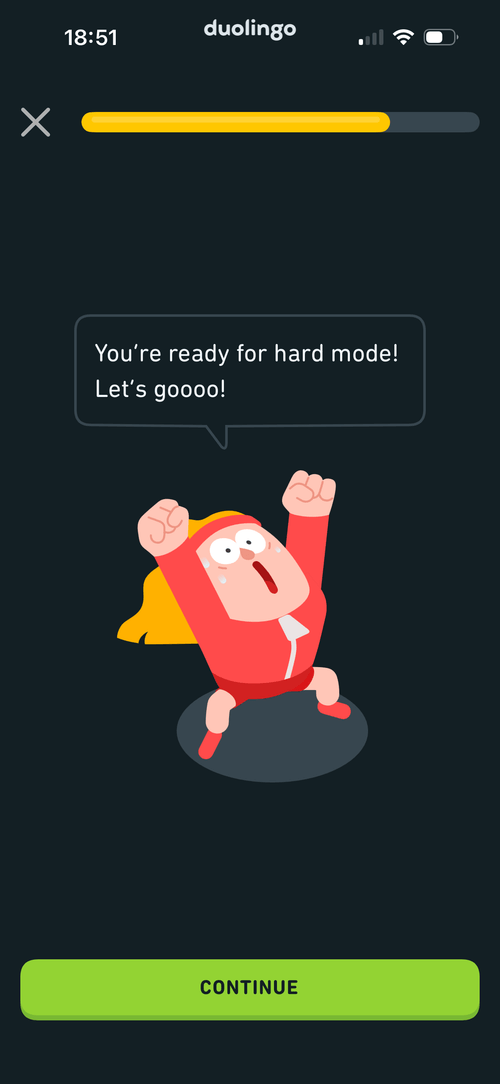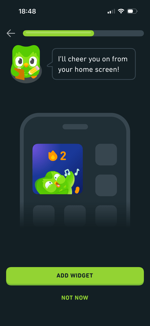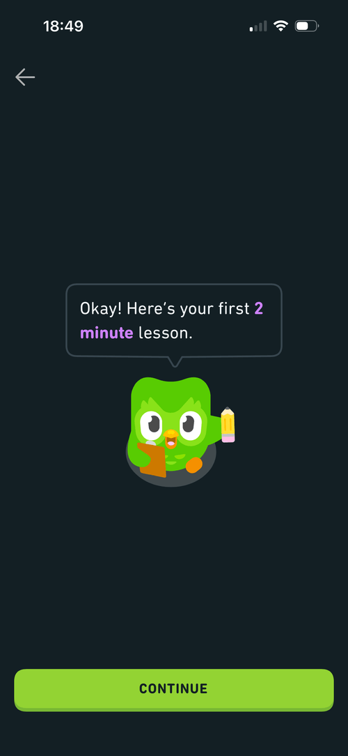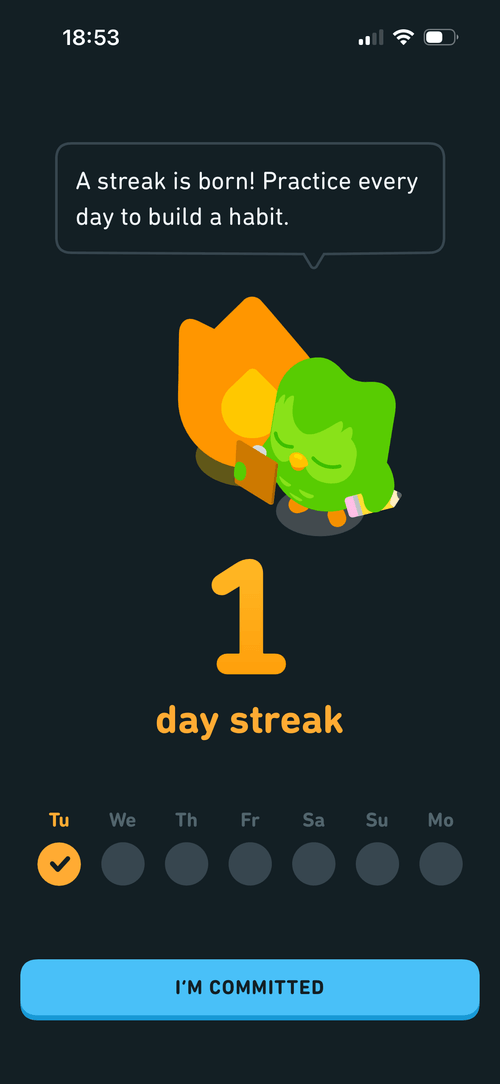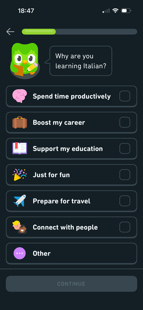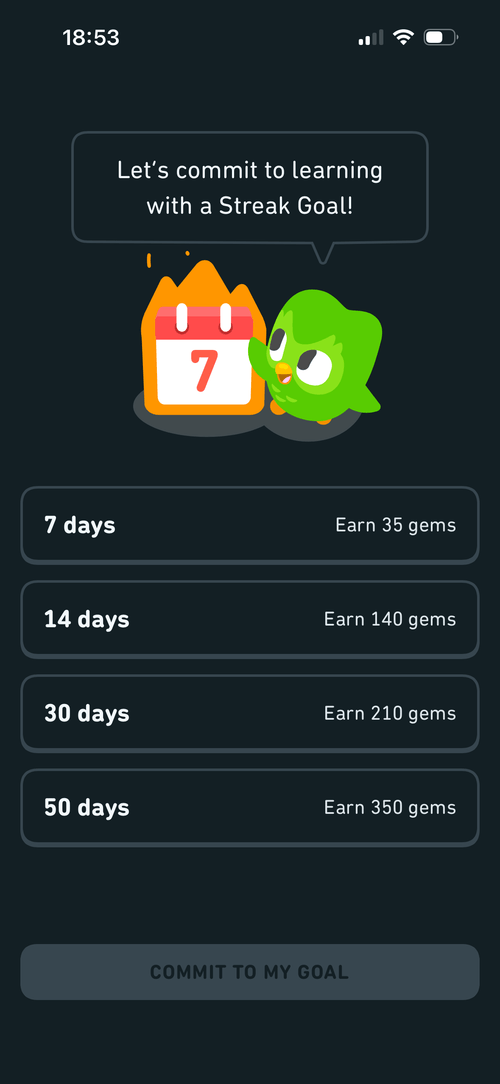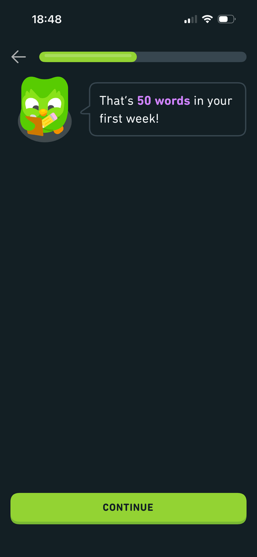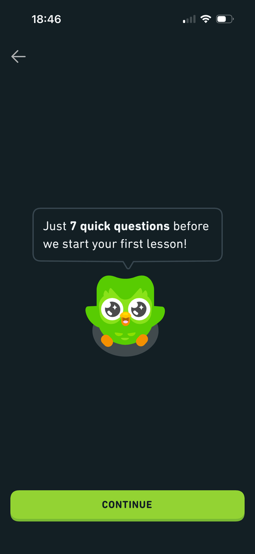 Duolingo’s onboarding is possibly one of the longest you'll find, but their mix of gamification, personality and progressive engagement entices you through.