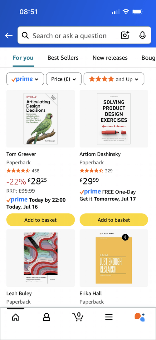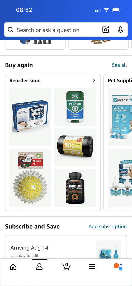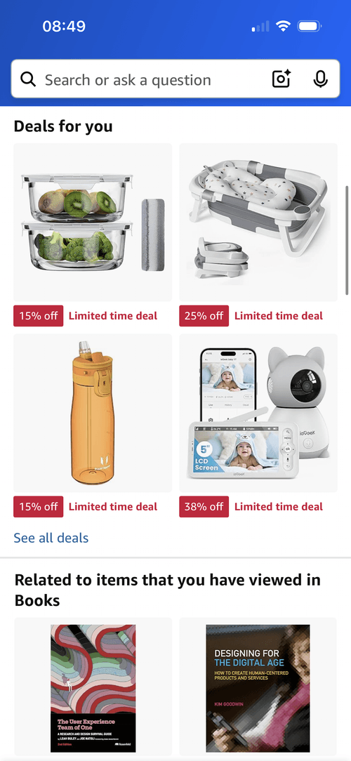 Amazon's product discovery experience is renowned for how many ways they target customers psychologically. From visually prominent urgency cues to default recurrence of past behaviours, the experience is heavily optimised to shift users from casual scrolls to considered actions.